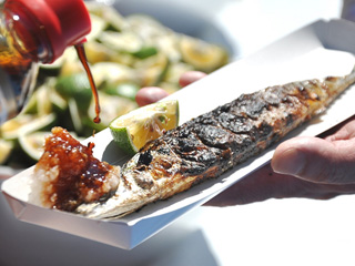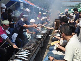 落語「目黒のさんま」に因んだおまつりで、気仙沼市民の贈り物「新鮮なさんま」を、その場で焼いて食べます。秋の味覚「さんま」に大分県のカボスを添えて召し上がっていただきます。