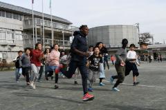 児童との質問コーナーのあと、グレ選手は一緒に校庭を走り、児童たちと触れ合いました。