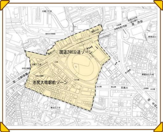 目黒区大橋一丁目周辺地区(約11.3ヘクタール)は、「目黒川と国道246号線を軸に、人にやさしく歩く楽しみのあるしゃれた街並み景観づくり」を目指し、平成18年2月東京都の「東京のしゃれた街並みづくり推進条例」に基づく、街並み景観重点地区に指定されました。