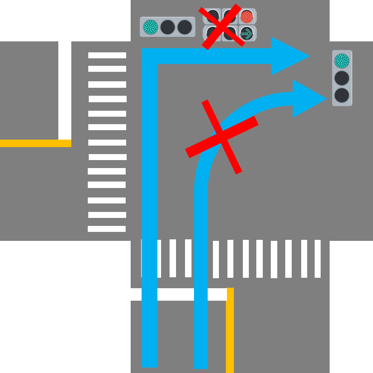 青信号で交差点の向こう側まで直進し、その地点で止まって右に方向を変え、前方の信号が青になってから進まなければなりません。いわゆる二段階右折を行います。右向きの矢印信号では進んではいけません。