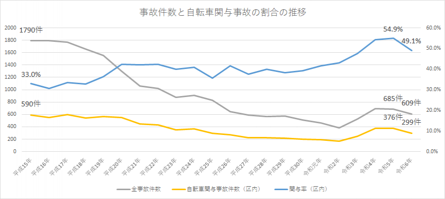 令和6年は、自転車が関与する事故件数が交通事故全体の49.1パーセントと、前年よりは下がったものの依然、約半数を占めており、死傷者数も約4割強を占めています。推移をみても、交通事故件数が6割以上減っているのに対し、自転車が関与する事故は3割程度しか減っていません。