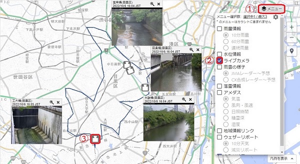 (1)メニューを開く(2)ライブカメラにチェックを入れる(3)アイコンをクリック の順でライブカメラをご覧いただけます。
