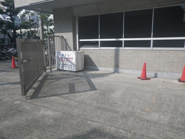 (西口) 平常時は柵が閉じておりますので、開けて土のうをお取りください。