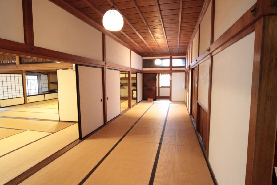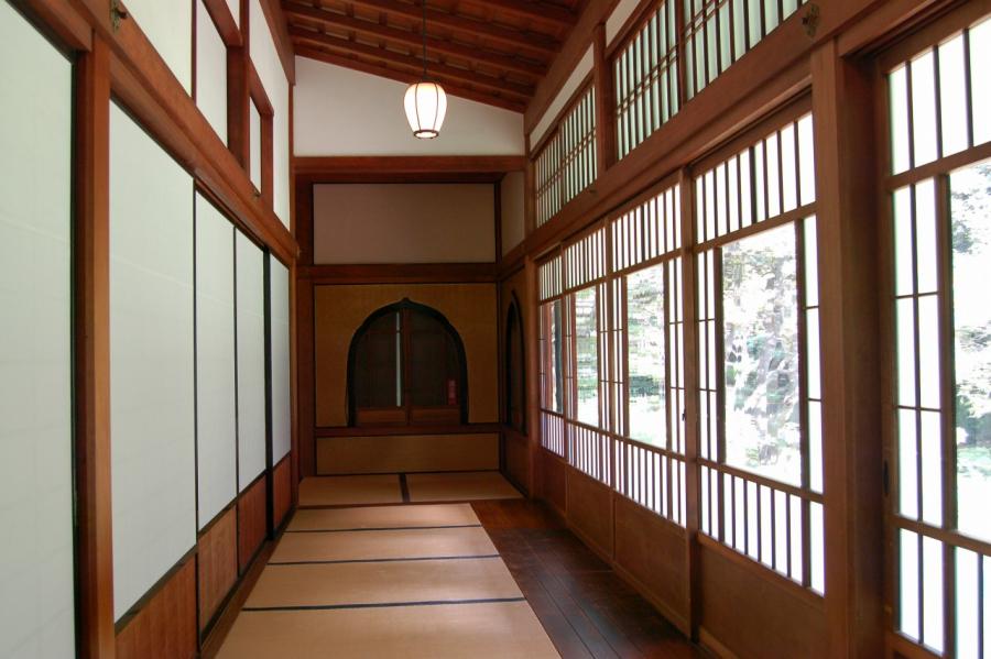 いりがわ。書院造で濡れ縁と座敷の間の一間幅の通路。ここは畳敷きとなっていて、目の前の日本庭園の眺望が楽しめます。