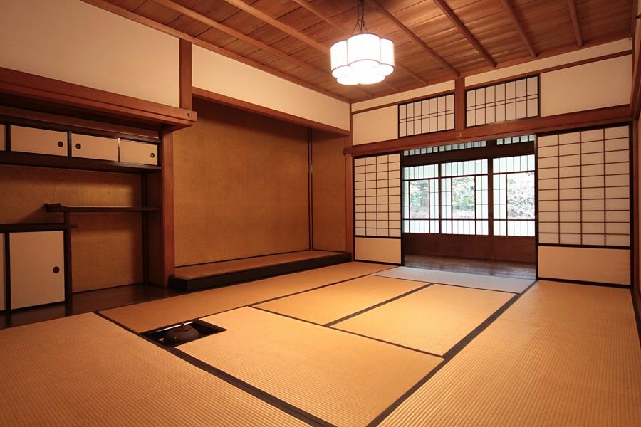 続き間から中廊下を隔てた奥の、10畳の小座敷です。もともとの用途は未詳ですが、床の間と違い棚を備え、襖には雅邦の四季山水図が使用されていたことから、格式のあった部屋であることが分かります。