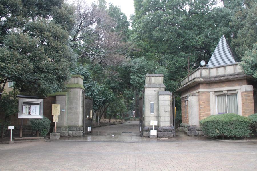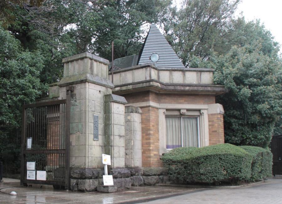 旧前田家本邸はもともと本郷(現在の東京大学内)にありましたが、昭和5年(1930)、旧加賀藩主前田家16代当主前田利為(としなり1885-1942)侯爵が駒場に本邸を移転しました。駒場本邸の敷地は約4万平方メートルあり、正門前の花崗岩の敷石と縁石は本郷邸で使用されていたものです。正門は間口6.2メートル、門柱から左右に塀が延び、門衛所が付属します。