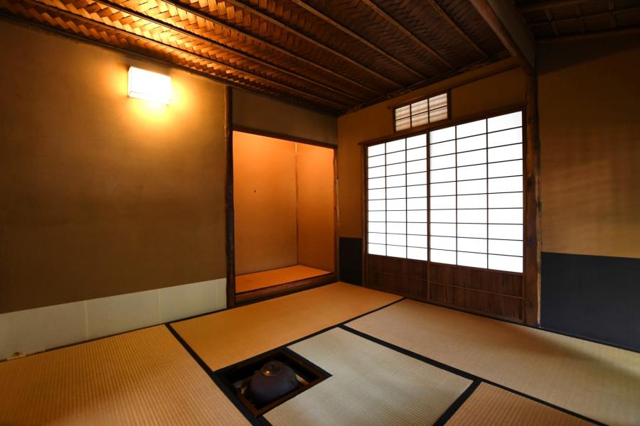 木村清兵衛の設計になる、裏千家の代表的茶室である又隠(ゆういん)を基にした(写しとした)、四畳半の席の茶室です。又隠の席名は、千利休の孫である千宗旦(1578-1658)が、隠居所として今日庵(こんにちあん)を建てたのち、再度の隠居に際して新たに造って「また隠居した」ことに因むものです。ただし又隠では窓であった床の右手が、この茶室では立ったまま出入りできる貴人口(きじんぐち)となっています。