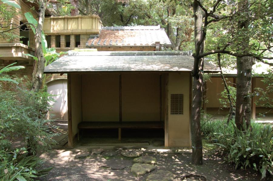 茶会の際に、客人が待つ場所として用意されました。茶室への路地伝いにあり、茶室とは流れによって隔てられています。前面には4人程度が座れる腰掛と、背面側には雪隠(せっちん。便所)があり、客人が気持ちを整え、快適に過ごす工夫がされています。木造・銅板葺で、杉丸太の柱、天井は化粧屋根裏、内外部の壁は白漆喰塗です。客人は、主人から呼ばれると、「にじり口」という低くて狭い戸から、頭をぶつけないように茶室に入ります。これは、全ての人は平等という考えや、日本人のお辞儀の挨拶につながると考えられています。