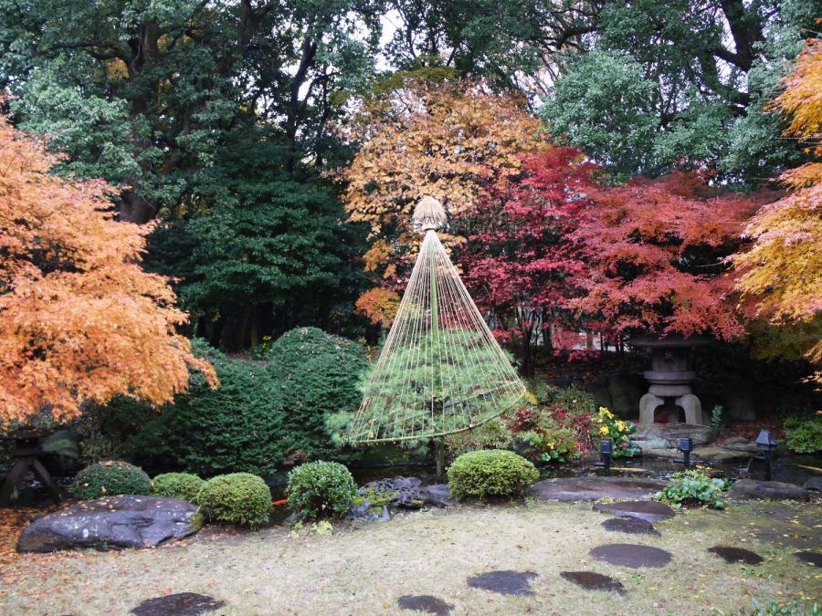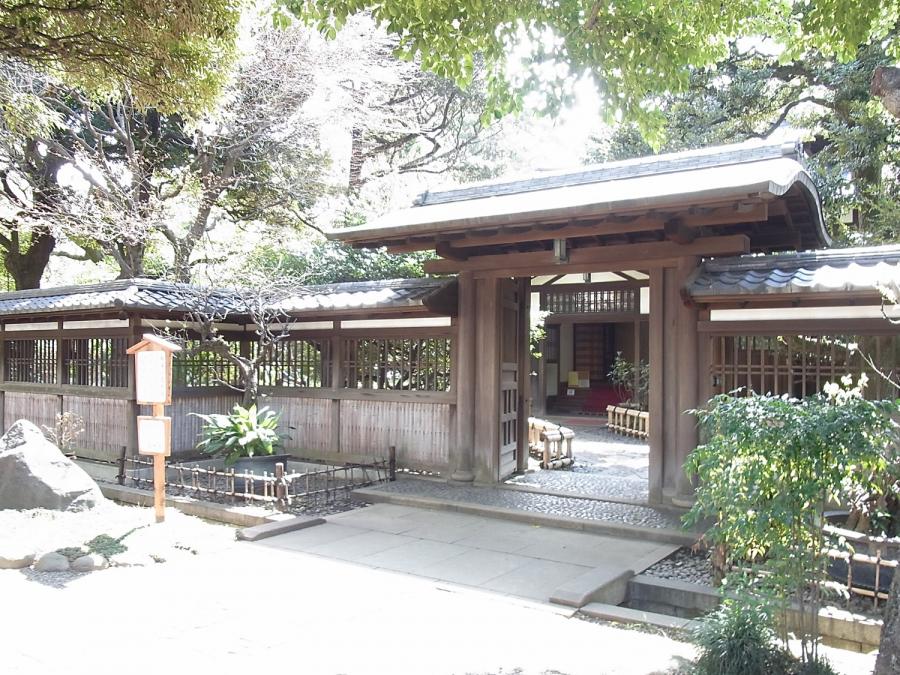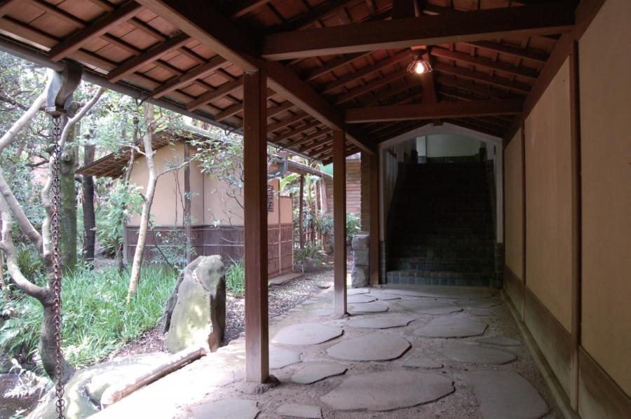 洋館の東側に設けられた和館は、周囲を和風の門や塀で仕切り、南側には和風の庭を配した和の空間を作り出しています。和館門は、唐破風が両側面につく平唐門という形式で、唐破風頂部の鬼瓦には前田家の幼剣(ようけん)梅鉢紋が掲げられています。和館塀は、上部を格子に、下部を割竹張りとする形式で、格子から和館が見え隠れします。また、門から和館玄関までは石畳みの園路を斜めに取るなど、重厚になりすぎない配慮がされています。平成24年(2012)にX線調査を行ったところ、門の柱廊部にアンカーボルトが埋め込まれていることが分かり、関東大震災(大正12年)後の設計ということもあり、当時から優れた耐震対策が施されていました。