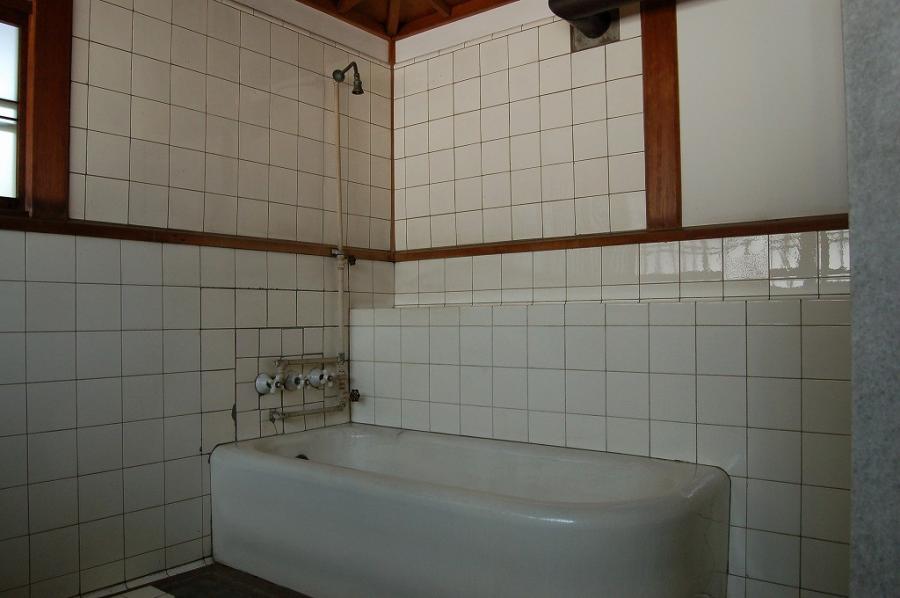 階段の踊り場に設けられた便所と浴室です。当時としては最新設備であったドイツ製ボイラーのほか、洋風のバスタブ、洗面台と洋式の便器(この2点は東洋陶器製)が備えられ、浴室の床もタイル張となっています。