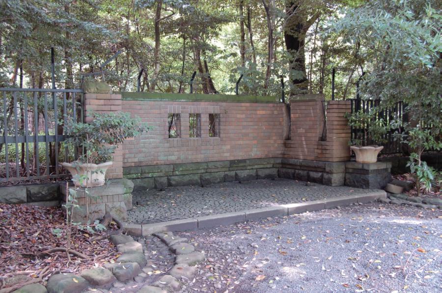 洋館の玄関周りと、南の芝庭などの庭園とを区切る塀です。洋館から車回しの円周路に沿って西へ延び、中央にパーゴラ(腰掛付き)と西寄りに庭門を設けています。洋館と同様に、大華石やスクラッチタイルで装飾されていますが、門扉、鉄柵、パーゴラ、腰掛などは失われています。南の芝庭では、かつては園遊会が開かれ、また侯爵の家族が乗馬やスキーを楽しんだと伝わります。洋風の芝庭の周囲には築山が築かれ、その奥の園路周辺には石灯籠など和風のしつらえが配されています。