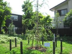 もともとは生産緑地として保全されてきた経緯があり、貴重な緑地とオープンスペースを活かした草原広場が整備されました。この広々としたのどかな空間で安らぎや憩いの時間を味わうことができるでしょう。さらに園内には、天皇陛下御即位の記念植樹であるヤエベニシダレザクラや生産緑地の頃からあったビワやカキなどの実のなる樹木が植えられていることで、四季折々の風景を楽しむことができます。