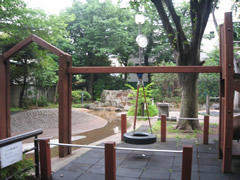 水遊びのできるじゃぶじゃぶ池があり、あふれ出た水は、園内を変化をつけながら流れます。また、ロープの張り巡らされた大型のアスレチック遊具があります。