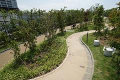 首都高速道路大橋ジャンクションの屋上、地上高さ7から35メートルに創出された面積約7,000平方メートルのループ状の庭園。ゾーン毎に四季を通じて“彩り”を楽しむことができる植栽材料を採用し、年間を通じてそれぞれに“見所”を演出している。