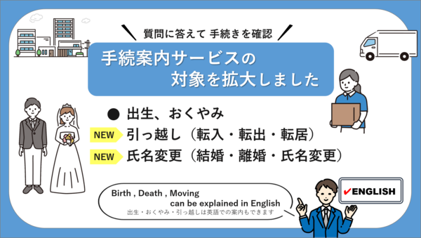 子どもが産まれた(出生)、どなたかが亡くなられた(死亡)場合の2つの手続内容に加えて、引っ越し(転入・転出・転居)や氏名変更(結婚・離婚・氏名変更)に関する内容もご案内できるようになりました。