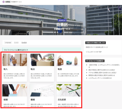 手続案内サービスは、多くの方に該当する手続きについてご案内しています。ご案内の内容以外で目黒区の各部署に届出などを要する場合があります。その際は、お手数ですが関係部署へご相談ください。