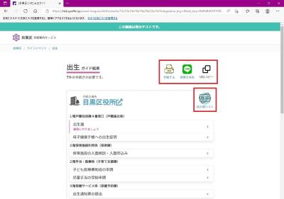 その後、表示される質問に答えて頂くと、結果画面が表示されますのでそちらで手続きができる場所、窓口や必要な持ち物などをご確認ください。結果画面は、紙に印刷したり、ご自身のLINEアカウントなどに共有することが可能です。
