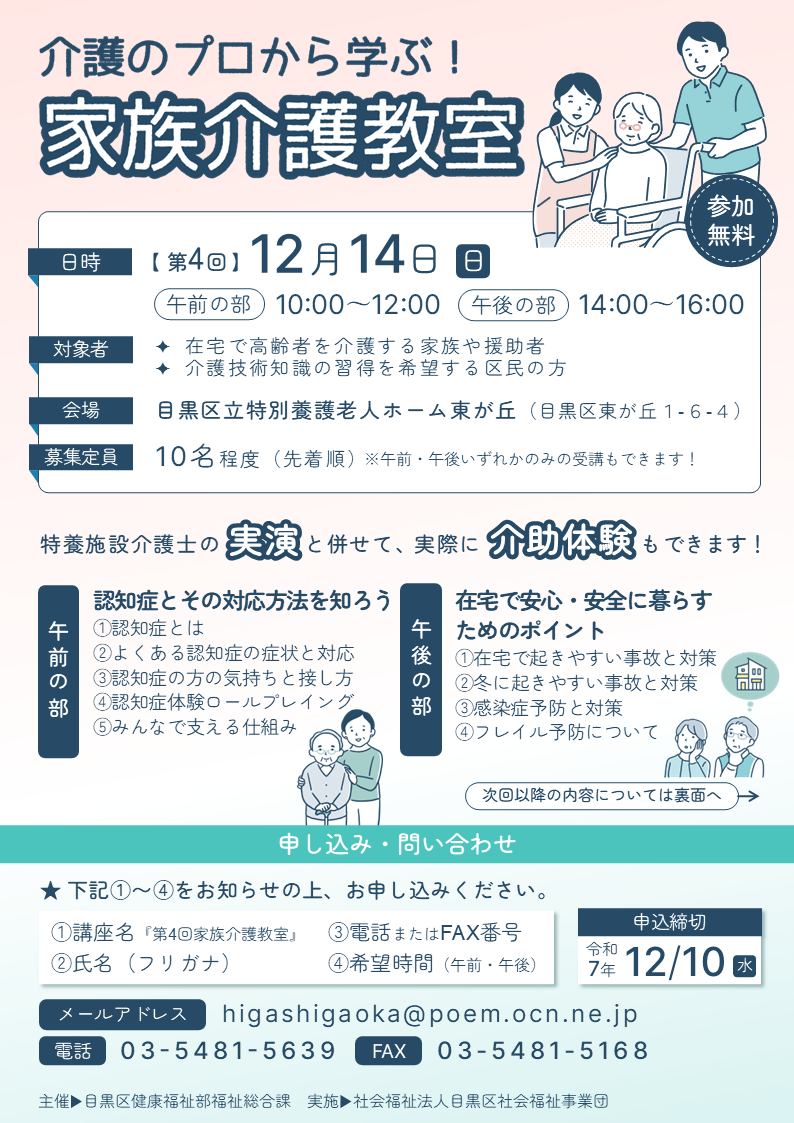 目黒区では、介護者支援の一環として、区立の特別養護老人ホームにて「家族介護教室」を開催しています。