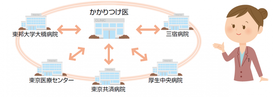 目黒区医師会では、かかりつけ医と区内の5病院をつなぐ「認知症連携パス」を運用しています。かかりつけ医を通して、5つの病院での専門的な診断を受けることができます。