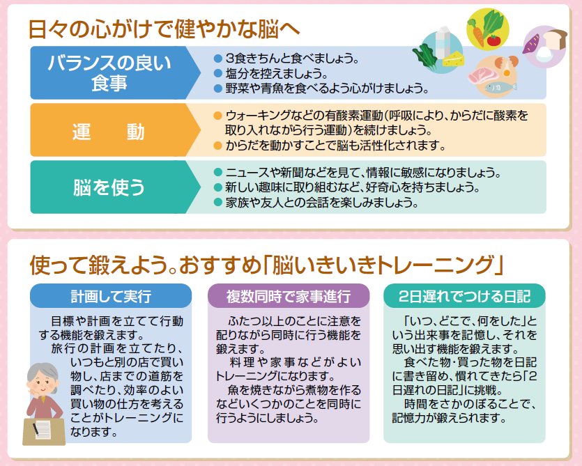 健康でいきいきと暮らし続けるために、適切な運動や食事の工夫で生活習慣病(高血圧・糖尿病・心臓病など)を防ぐとともに、視覚・聴覚・味覚・嗅覚・触覚の五感を刺激し(歌を歌う、好きな服を着る、季節に合わせた献立を作るなど)、脳を活性化するように心がけましょう。