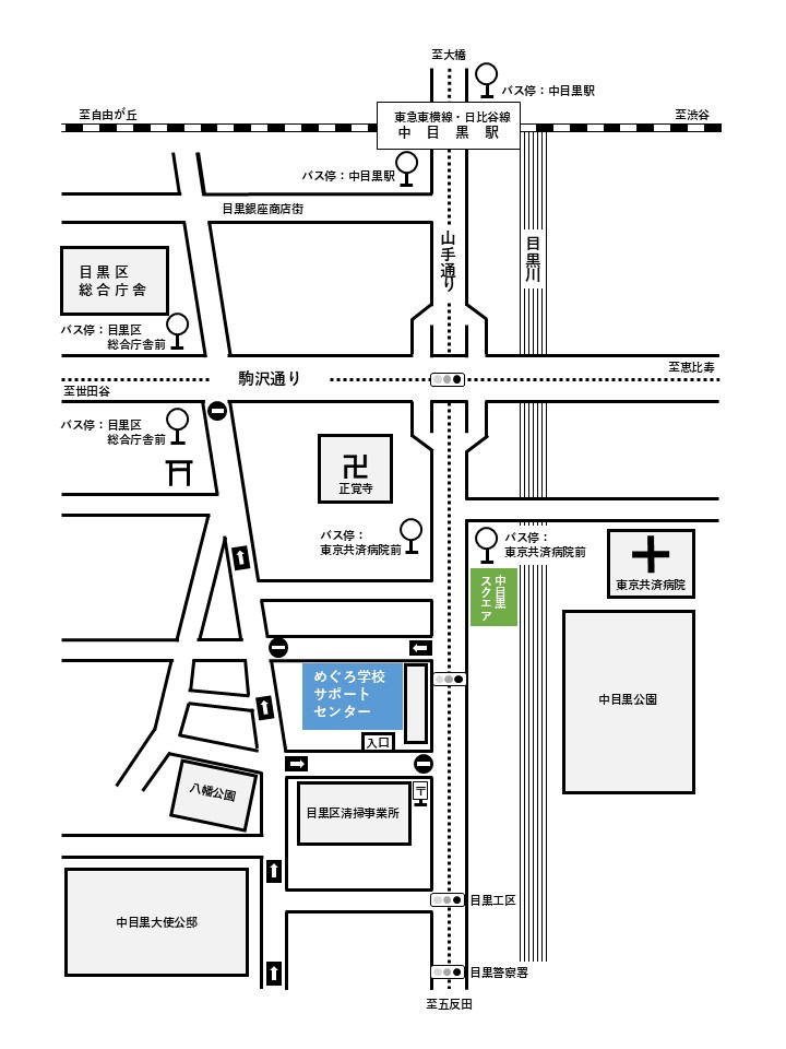 東急東横線または東京メトロ日比谷線「中目黒駅」を下車後、山手通りを目黒警察署の方面に向かって、右側の歩道を歩いてください。右手に、薄黄緑色の「目黒区清掃事業所(目印として郵便ポストがあります。)」が見えましたら、右折してください。少し歩くと、右手にめぐろ学校サポートセンターの建物が見えますので、正面入口からお入りください。