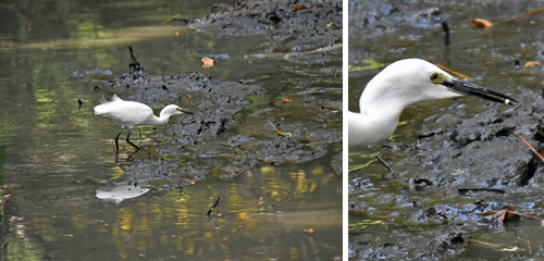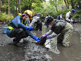 本日のかいぼりは、日ごろから駒場野公園で活動を行っているボランティア18人と区職員・駒場野公園自然観察舎職員及び業者など、計50人で作業が行われました。作業は「いきもの捕獲班」「いきもの運搬班」「いきもの泥落とし班」「いきもの仕分け班」「水槽管理班」「記録班」「誘導班」に分かれ、休憩をはさんで計100分間の捕獲作業が行われました。既に水が抜かれたエリアに入ると、泥と落ち葉などが分厚く堆積していることが実感でき、膝よりも深い汚泥に悪戦苦闘しながら、慎重に捕獲作業が行われました。