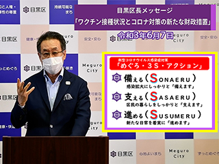 2つ目ですが、今後の新型コロナウイルス対策についてのご報告、予算措置についてのご報告です。私たちは「めぐろ・3S(スリーエス)・アクション2021」として、取り組みを進めています。最初のSは感染拡大に備えるS、2つ目は区民の生活をしっかりと支えるS、そして3つ目は新たな日常生活をしっかりと進めていくS、この3つのSで対応をしています。こういったことを踏まえて、今年度最初の予算では、30億円を計上してワクチン接種の対応や飲食業の皆さんが飛沫防止のために設置したパーテーションへの助成など57項目の予算化をしています。