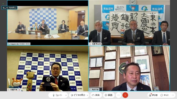 目黒区と友好都市協定を締結している宮城県角田市、気仙沼市と目黒区の3都市の首長でWeb会談を行いました。