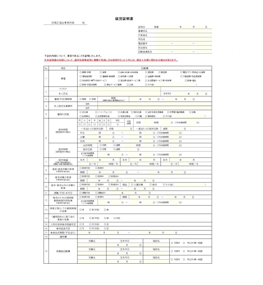 また、証明日が未記入のもの、証明日が提出月の当月・前月及び前々月以外のもの、証明日時点で就労開始していない就労証明書は無効です。