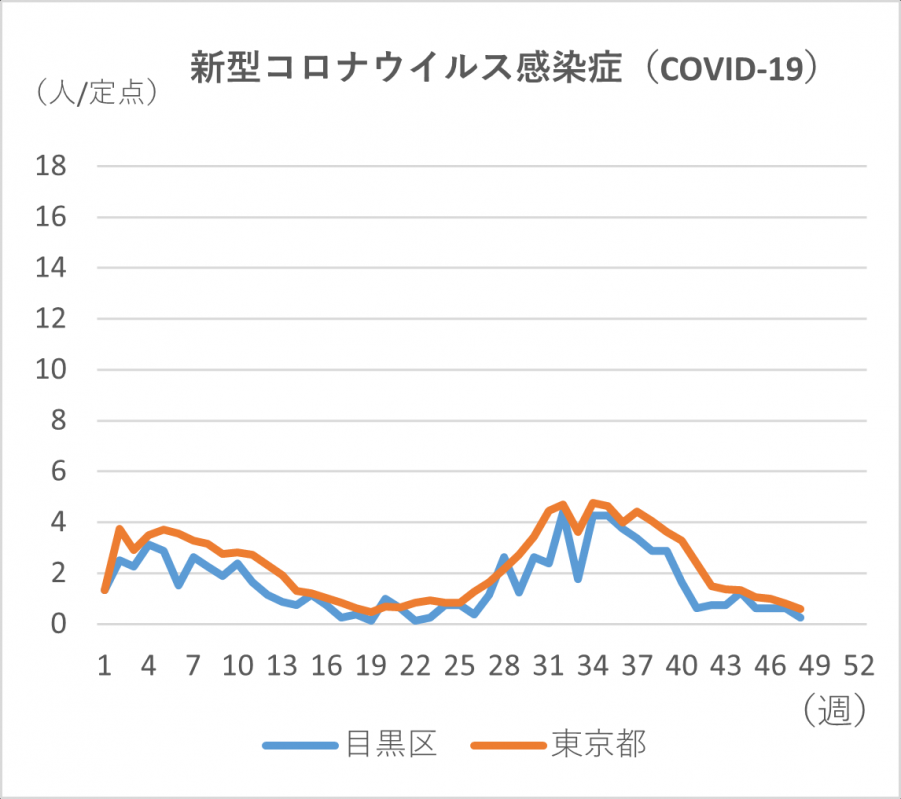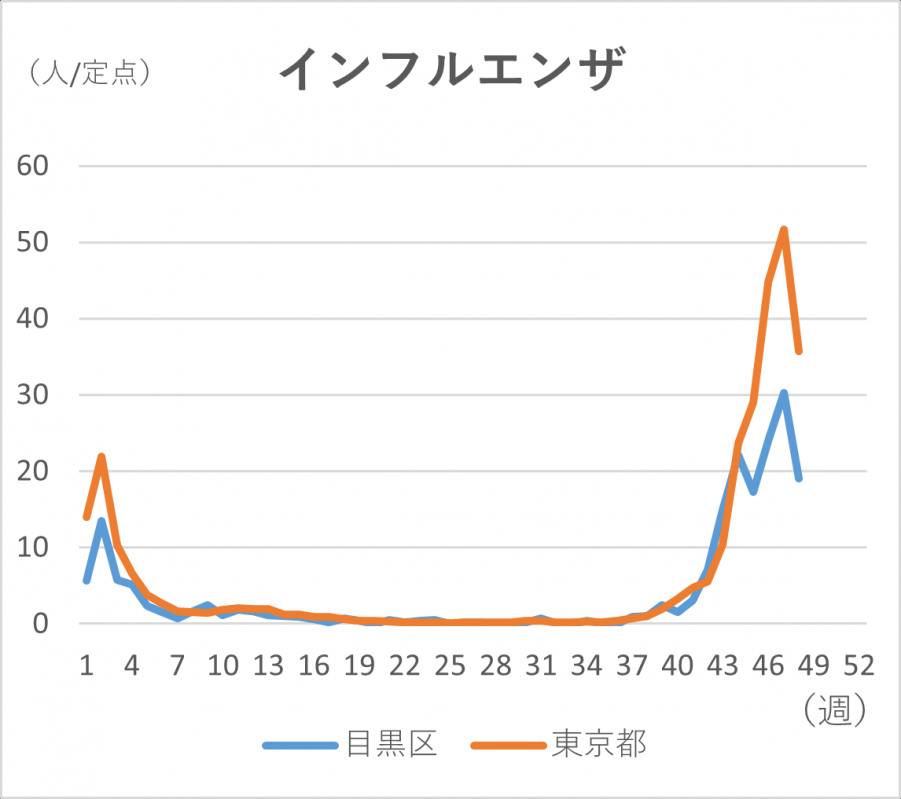 目黒区のインフルエンザ定点医療機関からの第48週(11月24日から11月30日)の患者報告数は1定点あたり19となり、前週より減少しました。