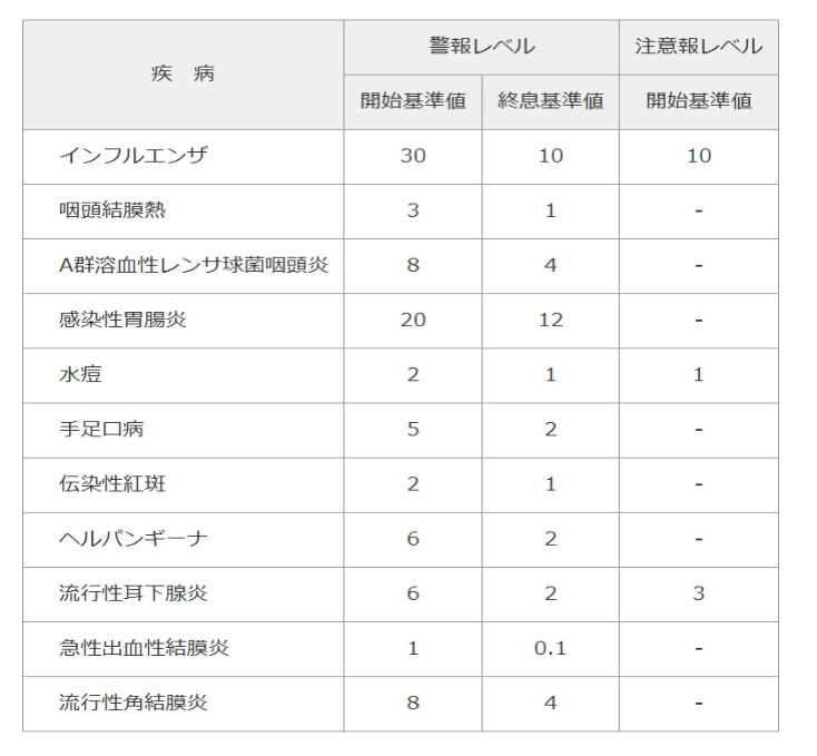 注意報・警報の開始・終息基準値は、疾患ごとに異なります。各疾患ごとの基準値は、以下のとおりとなります。