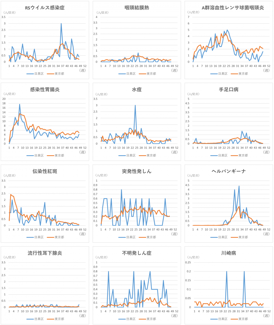 月曜日から日曜日までを1週間とする年間52週について、各週の目黒区内の指定届出機関(定点医療機関)からの定点報告疾患の発生状況をお知らせします。