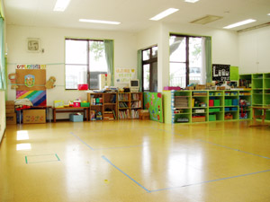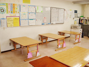 2階は静かに学習をしたりおやつを食べるスペースです。日当たりも良く緑に囲まれ、家庭な雰囲気のする部屋です。具合が悪くなった時はロールカーテンを引き、保健室に早変わりします。