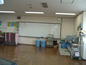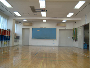 遊戯室は、主に体を使った遊びをする部屋です。縄跳びやフラフープ、こままわしなどの個人で楽しむ遊びや、ドッジボールやサッカー、ドンじゃんけんなどのみんなで楽しむ遊びをして、毎日盛り上がっています。全員で一緒に活動するときや、おやつを食べるときにも、この部屋を使います。