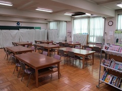 子ども達はこの部屋で、学習や室内遊びをして過ごします。昼食やおやつは、隣の家庭科室に移動して食べています。