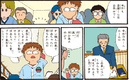 先生 「今日も倉握(くらあく)くんはお休みです。今日のホームルームは、このことについてみんなで考えてみようと思います」