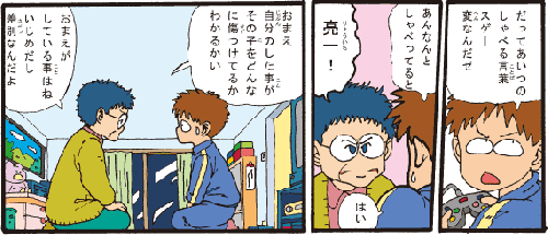亮一 「だって、あいつのしゃべる言葉、スゲー変なんだゼ。あんなんとしゃべってると…」