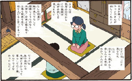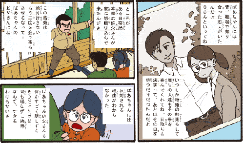おばあちゃん 「何日か経って、やっと父さんが話してくれたよ。Sさんは部落の出だからこの結婚は本家の許しを得られない、もしおまえたちが駆け落ちでもして結婚しようものなら本家はこの家と縁を切り、土地も財産もすべて取り上げると言ってるって。ひどい話だと思うだろ? ただ、父さんも母さんも苦しんでることはわかったんだよ。だけどね、あの時代じゃ本家に逆らって暮らしていくことなんてできなかったんだよ」