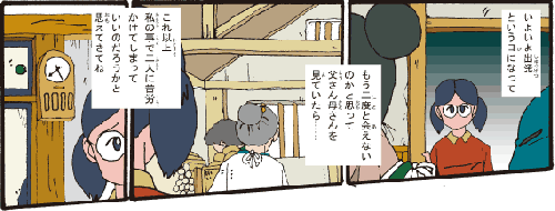 おばあちゃん 「いよいよ出発という日になって、もう二度と会えないのかと思って父さんと母さんを見ていたら… これ以上私のことで二人に苦労をかけてしまっていいのだろうかと思えてきてね」