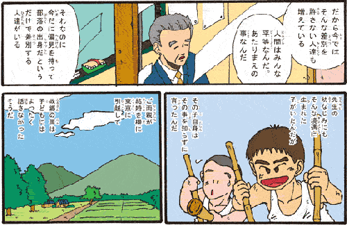 先生 「差別される理由なんてないんだ。そのことはみんなしっかりわかってほしい。部落というのは、今は『同和問題』と言われている。生まれでその人の職業や身分が決められ、引越しもできない。そんな時代があったんだ。つまり、生まれた時に、おまえはこういう人間だからこういう人生を送れと、決められてしまっていたんだ。そんなおかしなことをなくそうと、部落の人や多くの人たちが取り組みはじめたんだ」