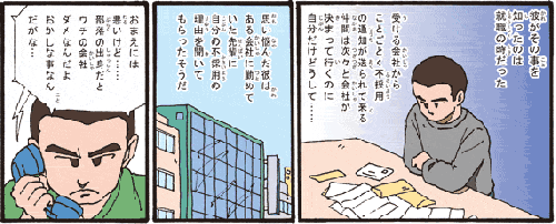 先生 「彼がそのことを知ったのは、就職の時だった。受ける会社からことごとく不採用の通知が送られてくる。仲間は次々と会社が決まっていくのに、自分だけどうして… 思い悩んだ彼は、ある会社に勤めていた先輩に、自分の不採用の理由を聞いてもらったそうだ」