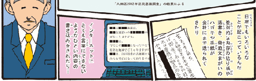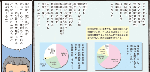 先生 「どこで生まれたかなどということは、仕事の能力や適性とはなんの関係もないことだ。にもかかわらず、現実はこうなんだ。結婚でも同じようなことが起こる。身元調査が行われ、結婚に反対されたり、結婚しても相手の両親や親戚との交際を拒絶されたりすることが起こっている。実際、彼もそうなんだそうだ。日常でもいろいろなことが起こっているんだ。差別的な内容の貼り紙や落書き、脅迫文まがいのハガキや手紙が会社にまで送られてきたり、インターネットにとても言葉にできないようなひどい内容の書き込みをされたり… 先生は、彼と今でも付き合っているし、尊敬もしている。もし、自分がその立場だったらどうなっていたんだろうかと、時々考えるんだ」