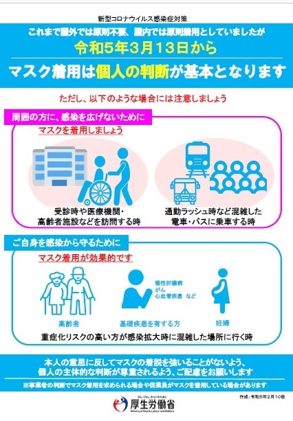 厚生労働省及び東京都から、令和5年3月13日以降のマスク着用の考え方(学校におけるマスクの着用の考え方については、令和5年4月1日から適用)が示されました。