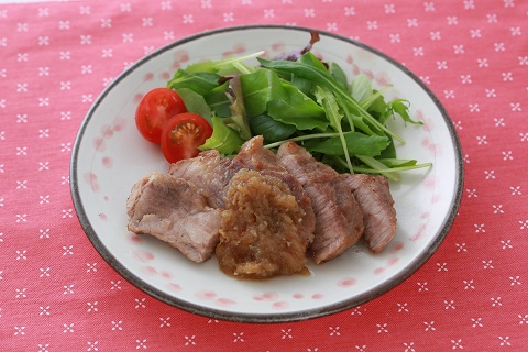 - 肉を食べやすい大きさに切り、ベビーリーフ・ミニトマトとともに盛り付け、1のソースをかける。