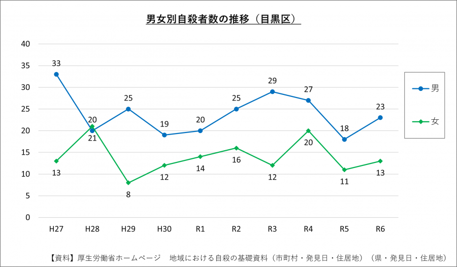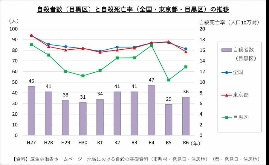 令和6年の全国の自殺者数は、20,320人であり、令和6年の自殺死亡率は、全国が16.27、東京都が15.72とやや減少しましたが、目黒区は12.88と増加しました。