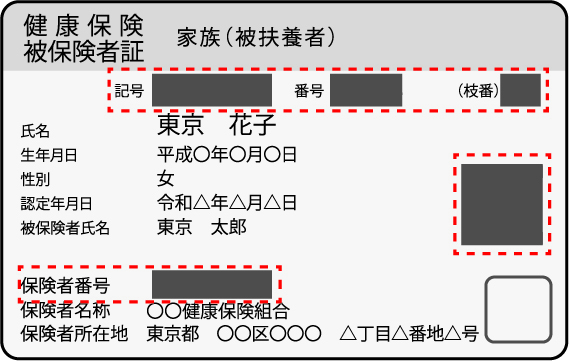 「記号」、「番号」、「枝番」、「保険者番号」、「二次元コード」にマスキング(黒塗り)を行った上で送付をお願いいたします。なお、住所が記載された裏面も必要となりますので、両面の送付をお願いいたします。(裏面に住所が記載されていない場合は、ご記入の上ご提出ください。)