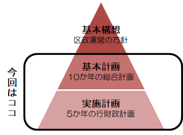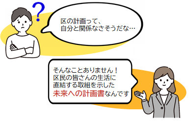 基本計画と実施計画は、子育て、教育、まちづくり、環境、災害対策など、区民の生活に直結する取組や事業を総合的に記した計画です。