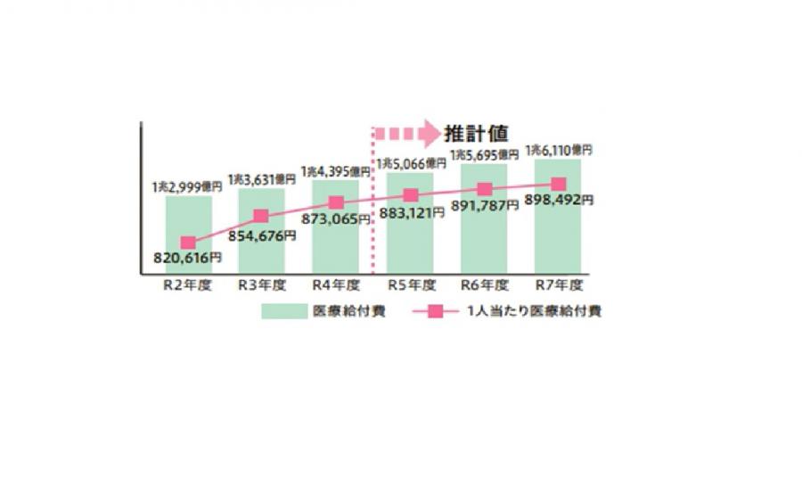 後期高齢者の皆様にご負担いただく保険料は、医療費の自己負担分(1割から3割)を除いた医療給付費の約1割分となっています。残りの5割は公費(国・都・区市町村)で、約4割は現役世代からの支援金で負担しています。表のとおり、医療給付費等の増加が今後も見込まれるため東京都後期高齢者医療広域連合にて2年に1度程度保険料率改定を行っています。