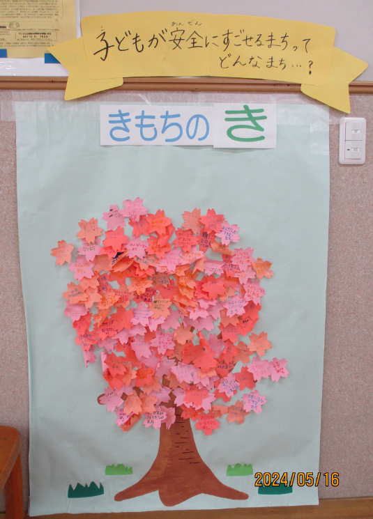 子どものきもちを聴取するため、子どもが楽しんで取り組めるよう、枝しか書かれていない絵を用意し、そこにテーマに関する自分の気持ちを書いた付箋を貼りつけ、子ども達が木を作るというワークを行い、貼られた付箋を要素ごとに分類して分析しました。