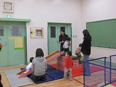 乳幼児のつどいでは、乳幼児と保護者が一緒に親子体操、工作遊び、音楽遊びなどを楽しみながら、子どもの創造性や協調性を養います。